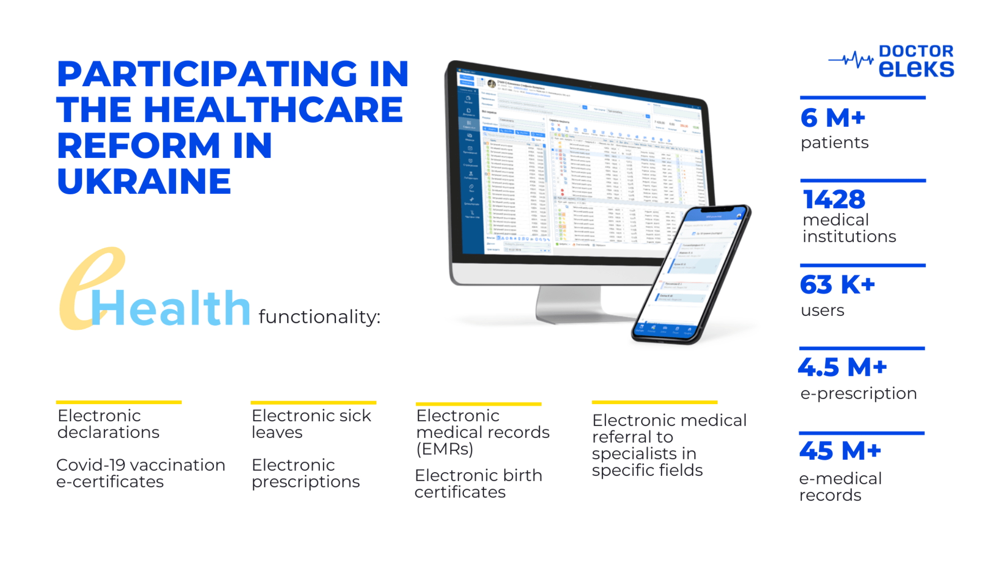 Doctor Eleks is a company that develops and deploys medical information systems (MIS) since 2005. The company’s products are used in more than 1500 medical institutions of Ukraine. Moreover, the developed MIS are also used in more than 100 medical institutions of the European Union.
