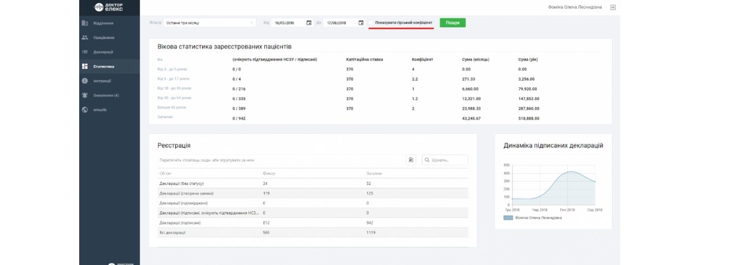 На нашому порталі у вкладці “Вікова статистика” за принципом калькулятора із врахуванням вікових коефіцієнтів, а також гірського коефіцієнта, вестиметься підрахунок коштів, які отримуватиме заклад за підписані декларації. Головний лікар може побачити, скільки коштів надійде за найближчий місяць, а також за рік. Дані доступні як в загальному по медичному закладу, так і по кожному лікарю індивідуально.