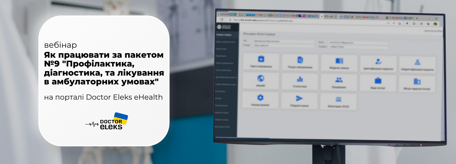 Компанія Doctor Eleks запрошує до участі у вебінарі на тему: Як працювати за пакетом №9 "Профілактика, діагностика, та лікування в амбулаторних умовах"